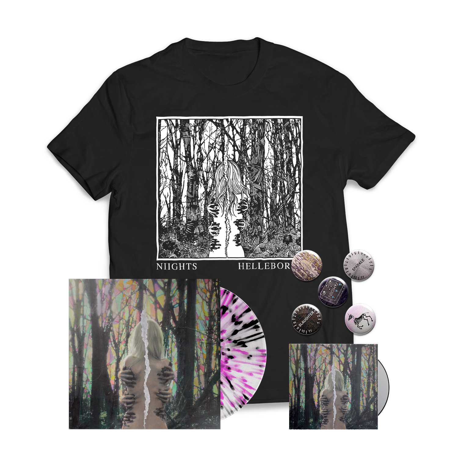 NIIGHTS - "Hellebores" Clear w/ Black & Pink Splatter Vinyl Bundle
