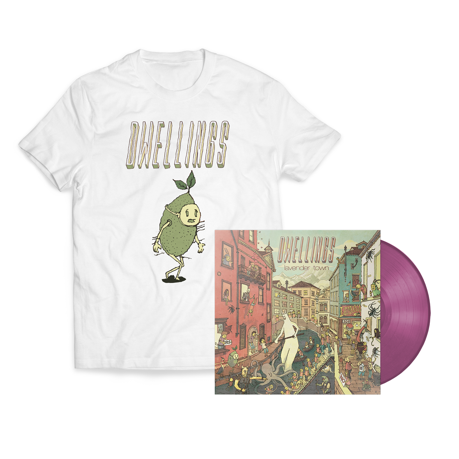 Dwellings - "Lavender Town" Opaque Lavender Vinyl + Lime Guy T-Shirt Bundle